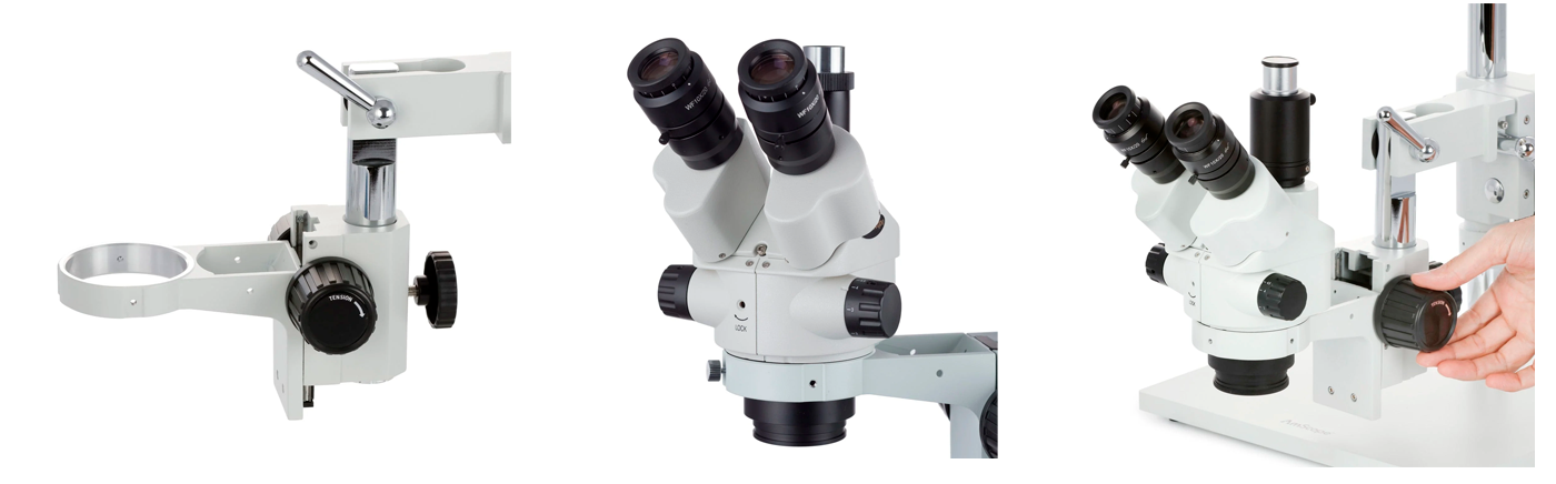 Mikroskopet er udstyret med 0,7X–4,5X zoomobjektiver, som nemt justeres via drejeknap. High-eyepoint 10X okularer gør systemet komfortabelt – også for brillebrugere. I stedet for indbyggede dioptrijusteringer anvendes fokuserbare okularer, hvilket giver mere ensartet fokus.