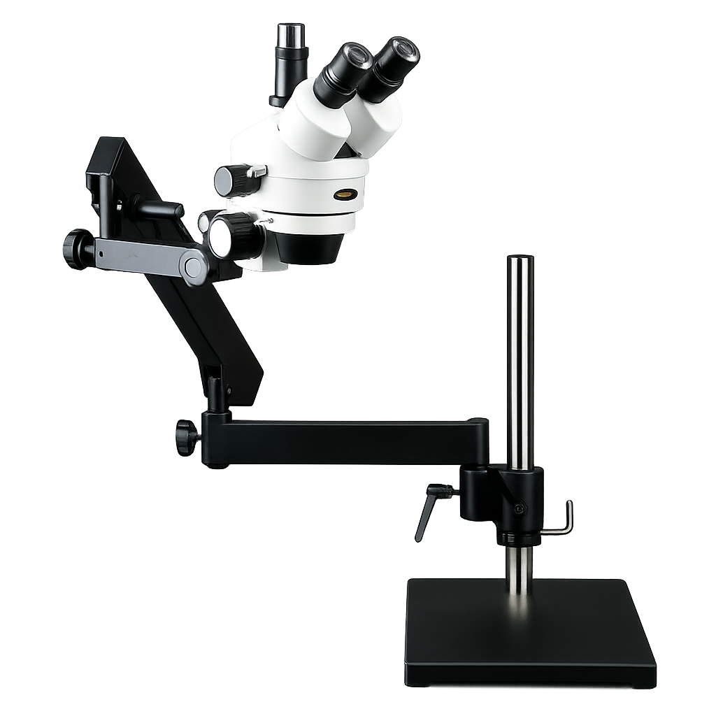 AmScope SM-7 Series er et kraftigt og alsidigt trinokulært stereomikroskop, udviklet til professionelle brugere, der har behov for stor fleksibilitet, høj billedkvalitet og mulighed for dokumentation. Mikroskopet kombinerer et bredt zoomområde, stor arbejdsafstand og en robust artikuleret stander, som gør det velegnet til både præcisionsarbejde og større emner.