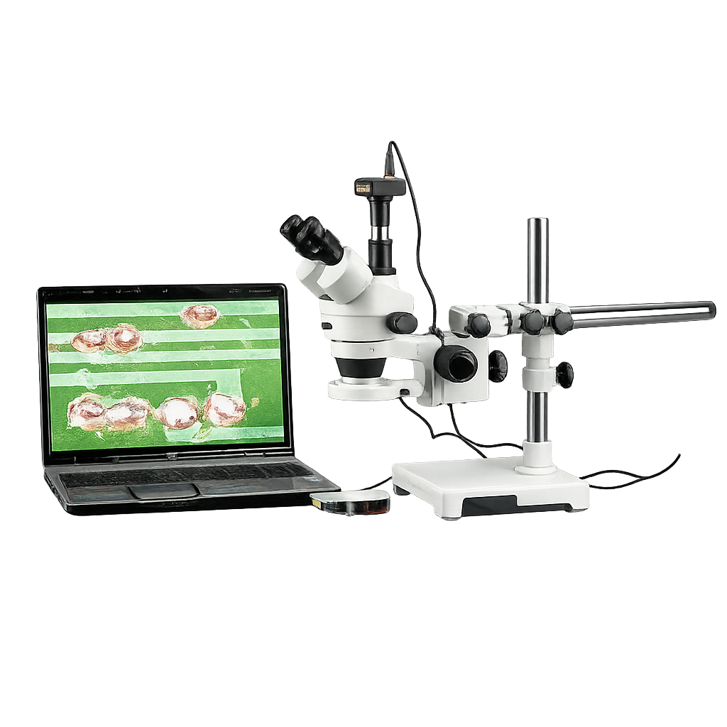 Trinokulært stereomikroskop 3,5X–90X med bomstativ, LED ringlys og 1,3MP kamera