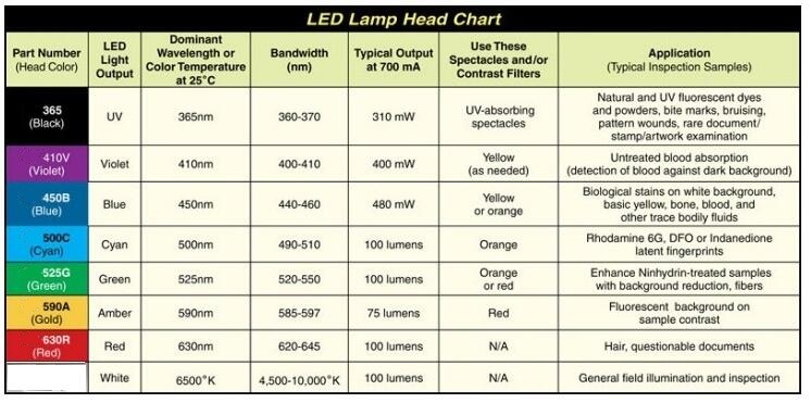 Med 8 separate LED-lygter, hver med sin egen bølgelængde, leverer enheden lys i spektrene 365nm, 395nm, 455nm, 505nm, 525nm, 595nm, 625nm og 6000K (Nichia LED *). Dette gør den ideel til et bredt spektrum af undersøgelser uden behov for farvefiltre.